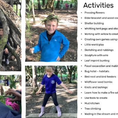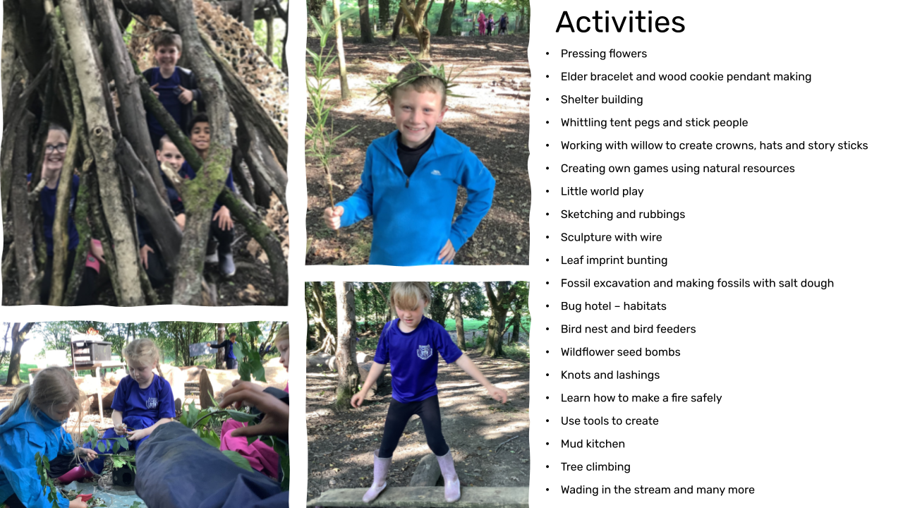 Activities available include making flower presses to make bookmarks, elder bracelet and wood cookie pendant making, shelter building, whittling tent pegs and stick people and working with willow to create crowns, hats and story sticks. Children will have the opportunity to learn a variety of knots and lashings, learn how to make a fire safely and use tools to create. Other activities include the mud kitchen, tree climbing and wading in the stream.