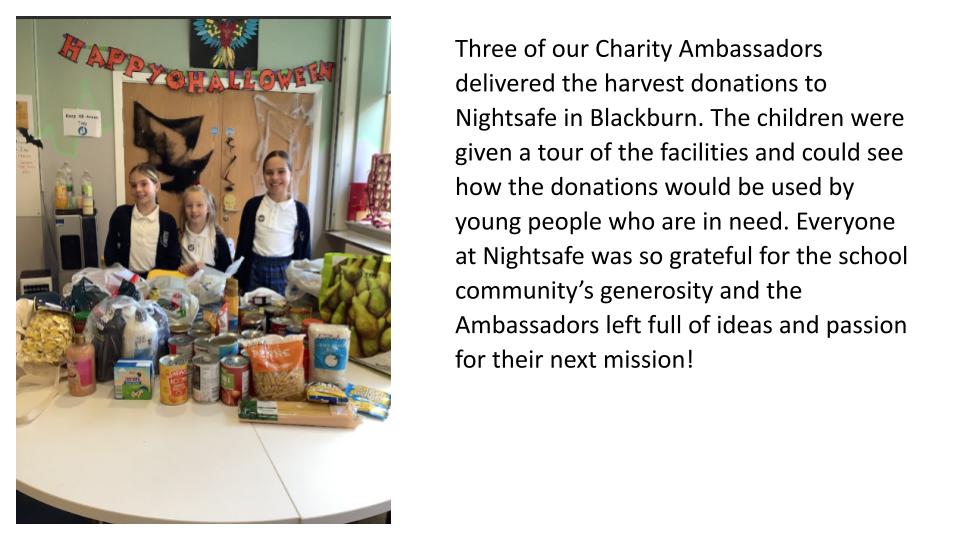 Our Charity Ambassadors have come back after the half term eager and excited to continue making a positive impact on the lives of others. They have discussed and created another donation list for our local partnering charity Nightsafe where the children are asking for food, toiletries and warm clothing donations. They have also discovered that Nightsafe are supported by Children in Need and are currently working along side our School Council members to find out the best way to raise money for on 16th November. After sitting down with the head of Nightsafe to review our long term plan and suggest any amendments they think need to be adjusted the children have been invited to visit Nightsafe this half term. Thanks o their brilliantly persuasive letters, Tesco Buckshaw have generously donated a trolley to the school.
